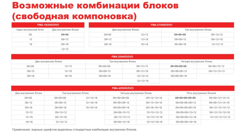 К наружным блокам могут подключаться внутренние блоки разного типа и производительности.