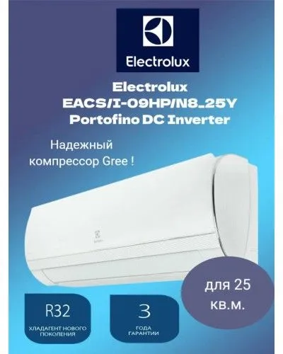 Electrolux EACS/I-09HP/N8-25Y (R32) NEW — это инверторная сплит-система серии Portofino Super DC-Inverter 2025, предназначенная для эффективного охлаждения и обогрева помещений площадью до 25 м². Работает на экологичном хладагенте R32, отличается высокой энергоэффективностью и расширенным функционалом.