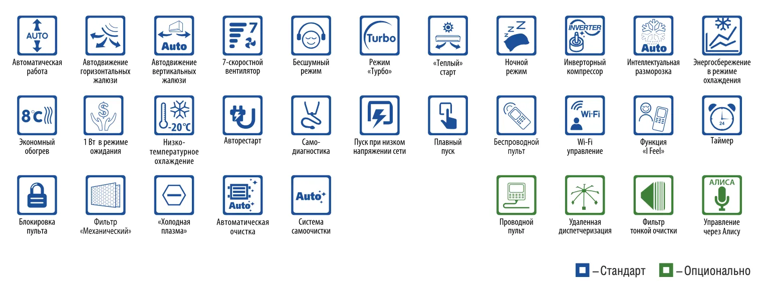 Для очистки воздуха в кондиционере предусмотрен традиционный механический фильтр от пыли и ионизатор "Холодной Плазмы". Ионизатор эффективно борется с вирусами, бактериями и даже неприятными запахами. Съемная передняя панель устройства позволяет самостоятельно поддерживать его в чистоте.