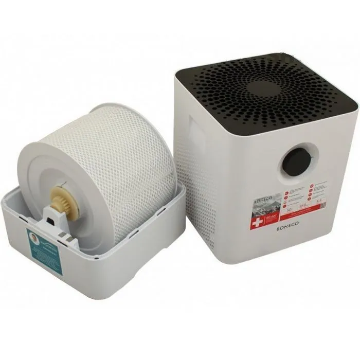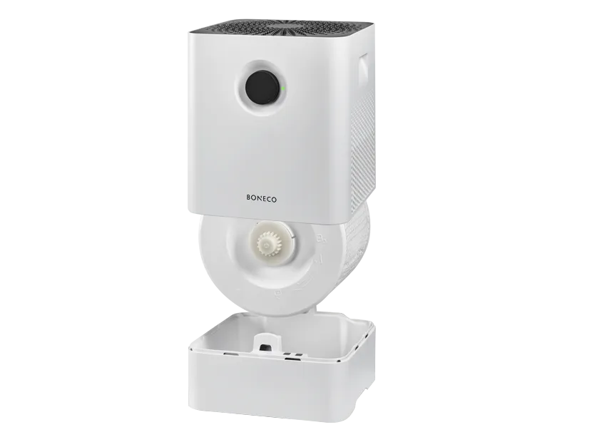 Внутри прибора расположен вращающийся барабан с синтетической губкой, которая увлажняется из резервуара. Вентилятор затягивает воздух, который проходит через губку. Загрязнения, пыль и аллергены оседают на ней и смываются в поддон. Очищенный и увлажнённый воздух возвращается в помещение. Уход за прибором прост: губку и барабан можно мыть вручную или в посудомоечной машине, поддон — раз в неделю.