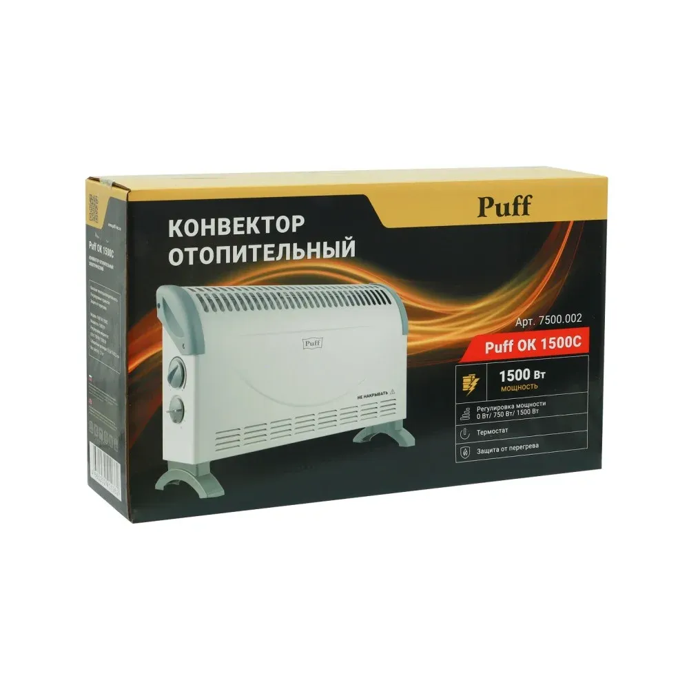 Электрический конвектор Puff-ОК 1500C — это современное решение для обогрева помещений, работающее от электросети. Его принцип действия основан на естественной циркуляции воздуха: прохладный поток поступает снизу, нагревается внутри корпуса при прохождении через нагревательный элемент и выходит через верхние вентиляционные отверстия, создавая комфортную температуру.