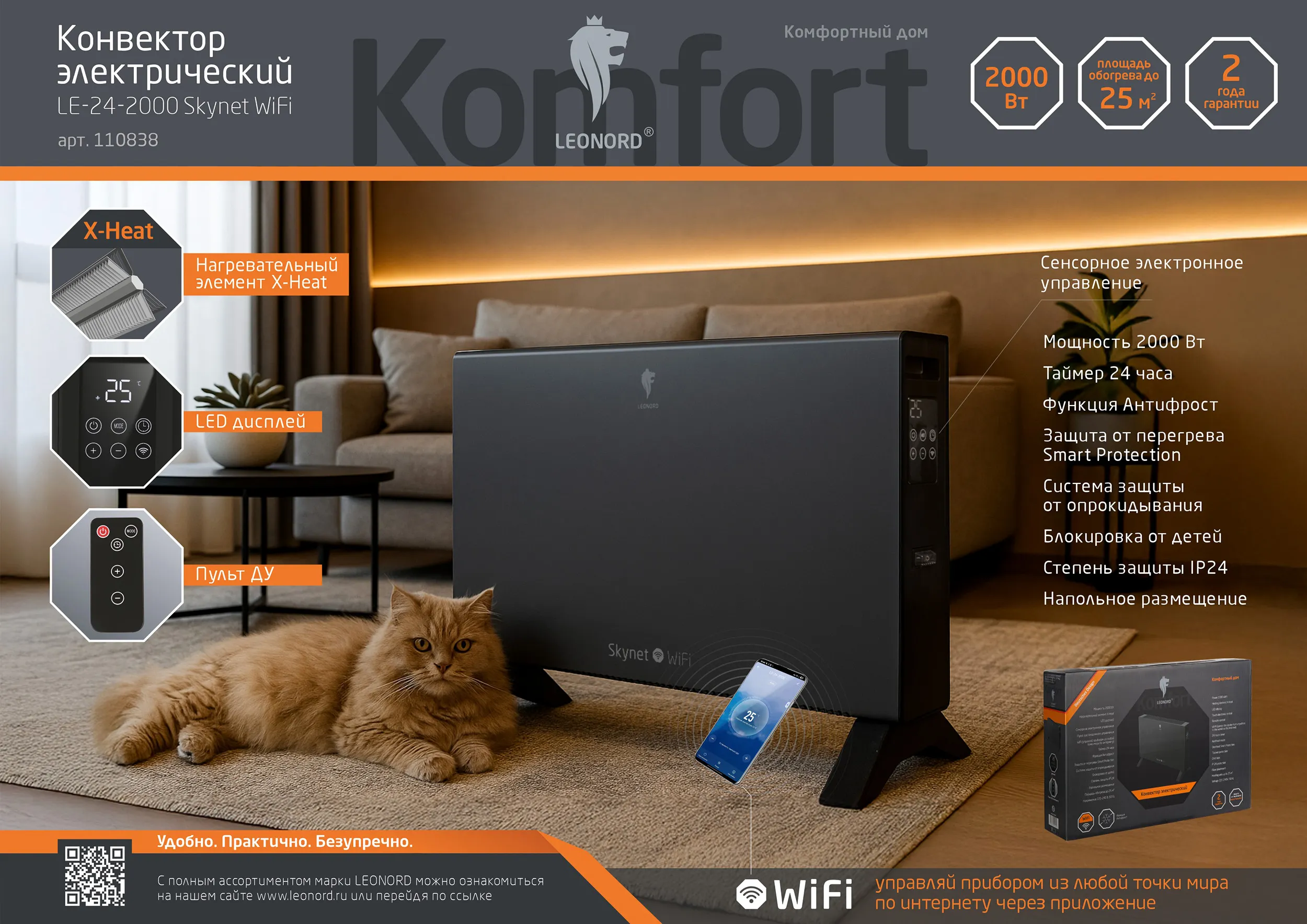 Leonord LE-24-2000 Skynet WiFi — это высокотехнологичный электрический конвектор, который обеспечивает эффективный и точный обогрев, а также предоставляет полный контроль над климатом в вашем доме через Wi-Fi. Мощный нагревательный элемент и интеллектуальное управление делают его идеальным решением для современного дома.Особенности и преимущества: