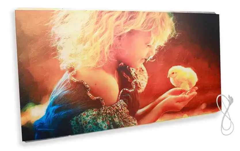 Главная особенность модели — возможность нанесения полноцветного изображения методом УФ-печати. Это позволяет превратить обогреватель в декоративную панель, картину или арт-объект, гармонично вписывающийся в интерьер. Клиент может выбрать изображение из готовой коллекции или предоставить собственное — фото, логотип, иллюстрацию. Печать устойчива к выгоранию, влаге и механическим воздействиям, не выделяет запахов и не теряет насыщенность со временем. Это делает модель особенно популярной в дизайнерских проектах, салонах красоты, бутиках, частных интерьерах и зонах приёма клиентов.