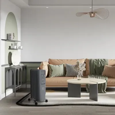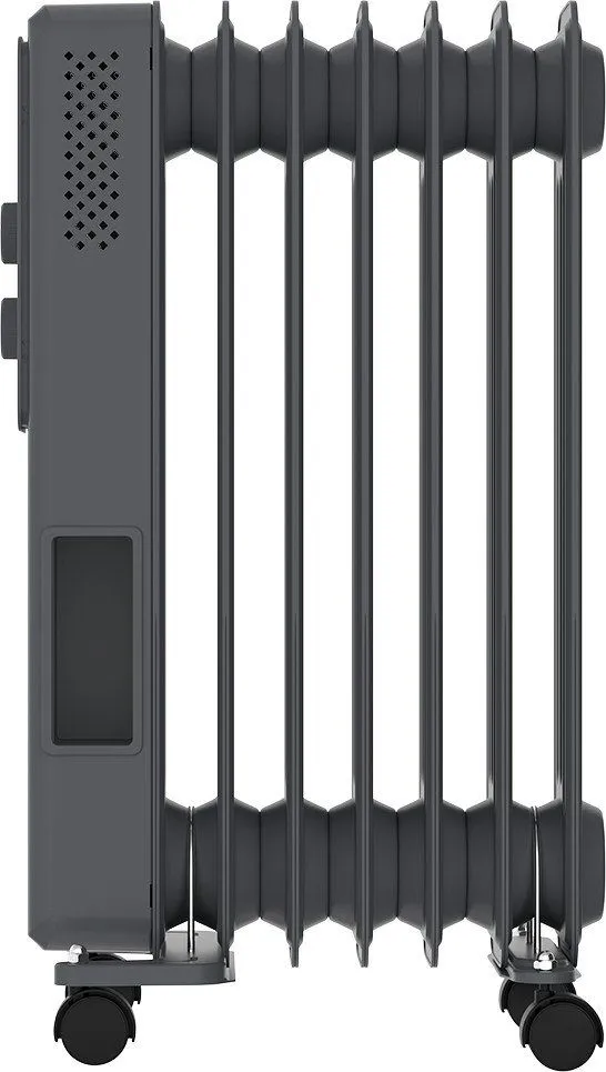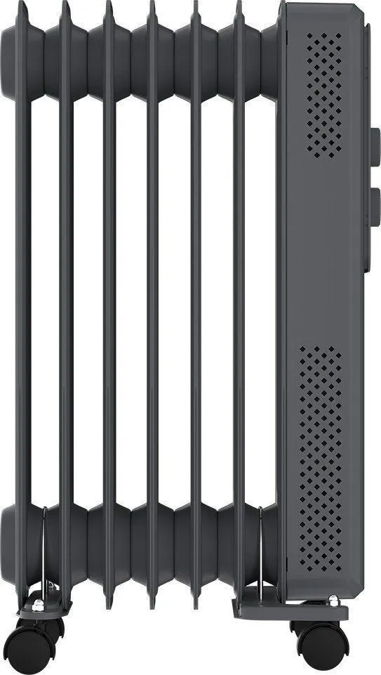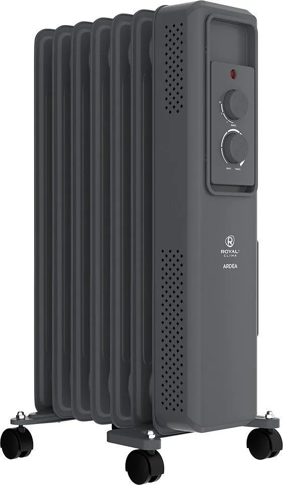 Масляный радиатор ROYAL Clima ROR-AR7-1500M из серии ARDEA — это надёжное и эстетичное решение для обогрева помещений площадью до 20 м². Прибор мощностью 1.5 кВт оснащён семью рёбрами размером 550×120 мм и четырьмя масляными каналами, что обеспечивает эффективную теплоотдачу и устойчивость конструкции. Премиальное матовое покрытие и классический графитовый цвет позволяют гармонично вписать устройство в любой интерьер.