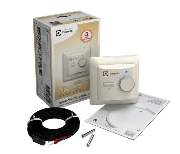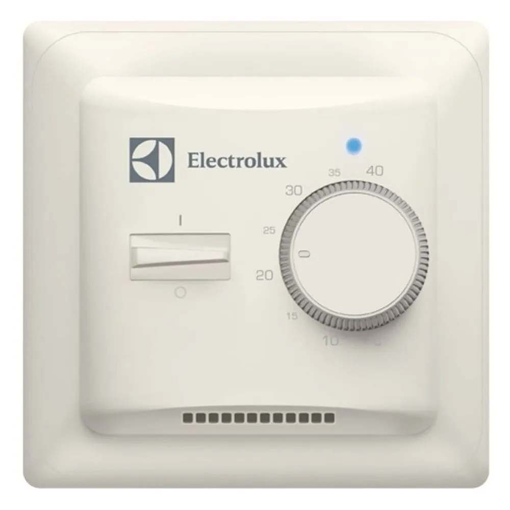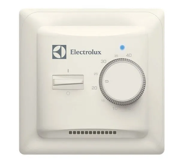 Электронный регулятор ETB-16 Electrolux с механическим управлением температуры пола и автоматическим её поддержанием на заданном уровне. Над регулятором находится светодиод, который покажет, что теплый пол в работе, когда температура достигнет установленного предела он отключится, либо поменяет цвет на зеленый или синий, в зависимости от модели.