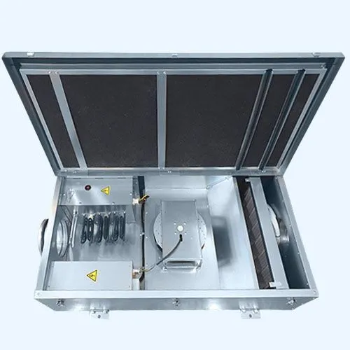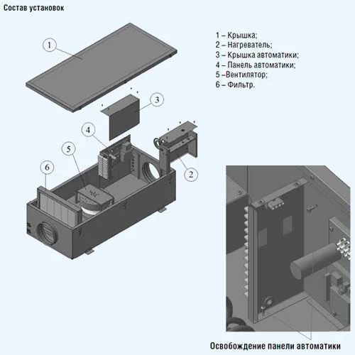 Корпус выполнен из оцинкованной стали, с звуко- и теплоизоляцией из базальтовой минеральной ваты толщиной 25 мм, обеспечивающей поглощение шума до 44 дБ. Установка предназначена для горизонтального монтажа на ровной поверхности, с обязательным заземлением.
