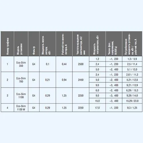 Производительность — 350 м³/ч, потребляемая мощность — 5,1 кВт, мощность нагревателя — 5,0 кВт, электропитание нагревателя — 400 В / 2 ф / 50 Гц, электропитание вентилятора — 230 В / 1 ф / 50 Гц, ток — вентилятор 0,44 А / нагреватель 13,0 А, обороты вентилятора — 2500 об/мин, рабочая температура — от +5 °C до +40 °C, фильтрация — G4, тип управления — встроенная автоматика с пультом Oazis (в комплекте).
