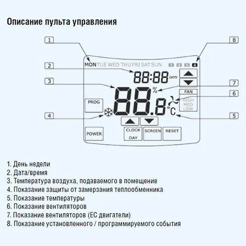 Управление осуществляется через встроенную систему автоматики, совместимую с канальными увлажнителями, охладителями, вытяжными вентиляторами, а также с сетевыми протоколами LAN и Wi-Fi. Это позволяет интегрировать установку в систему «умный дом» или BMS. В комплект входит выносной проводной ЖК-пульт, обеспечивающий полный контроль над параметрами работы: температура, скорость, таймер, аварийные сигналы. Поддерживается недельный таймер, функция самодиагностики, индикация включения и аварийная сигнализация.