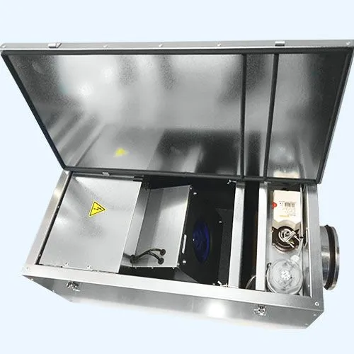 Вентиляционная часть включает энергоэффективный EC-вентилятор, обеспечивающий стабильную работу при низком энергопотреблении. Крыльчатка выполнена с загнутыми назад лопатками, что повышает аэродинамическую эффективность и снижает уровень шума. Встроенный воздушный клапан с электроприводомавтоматически перекрывает канал при отключении установки, предотвращая обратный поток воздуха.