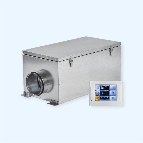 Управление осуществляется через встроенную систему автоматики, совместимую с канальными увлажнителями, охладителями, вытяжными вентиляторами, а также с сетевыми протоколами LAN и Wi-Fi. Это позволяет интегрировать установку в систему «умный дом» или BMS. В комплект входит выносной проводной ЖК-пульт, обеспечивающий полный контроль над параметрами работы: температура, скорость, таймер, аварийные сигналы. Поддерживается недельный таймер, функция самодиагностики и индикация включения.