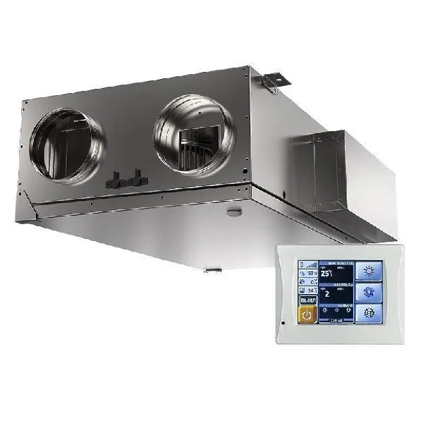 Производительность — 2000 м³/ч, электропитание — 220 В / 1 ф / 50 Гц, тип нагревателя — водяной (встроенный), тип монтажа — горизонтальный, потолочный (подвесной), с обязательной дренажной трассой, исполнение — универсальное (патрубок наружного воздуха слева или справа), фильтрация — EU5 на притоке и EU5 на вытяжке, регулировка скорости вентилятора и температуры — через пульт дистанционного управления, система управления — встроенная, пульт управления — в комплекте, класс защиты — IP44.
