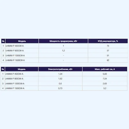Производительность — 1500 м³/ч, потребляемая мощность — 580 Вт, максимальная мощность нагревателя — 9 кВт, напряжение — 220 В, количество фаз — 1, сила тока — 3,2 А. Вентиляторы оснащены лопатками с обратным загибом и встроенной термозащитой двигателя, обеспечивающей безопасную эксплуатацию.
