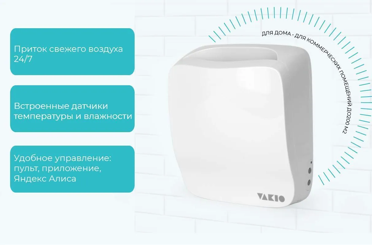 Прибор оборудован Wi-Fi-модулем для удаленного управления с помощью мобильного телефона, а также для настройки автоматической работы на основании данных, полученных от датчика качества воздуха VAKIO ATMOSPHERE.