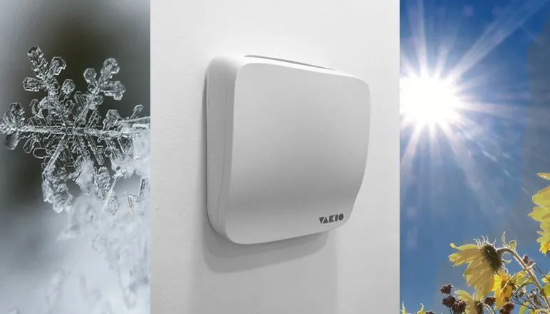 Датчик измерения температуры установлен внутри корпуса прибора, вблизи вент. канала, соответственно при значительной разнице температуры воздуха между улицей и помещением показания могут отличаться относительно средней комнатной температуры (не является неисправностью). Для более точной работы рекомендуется совместное использование с VAKIO ATMOSPHERE.