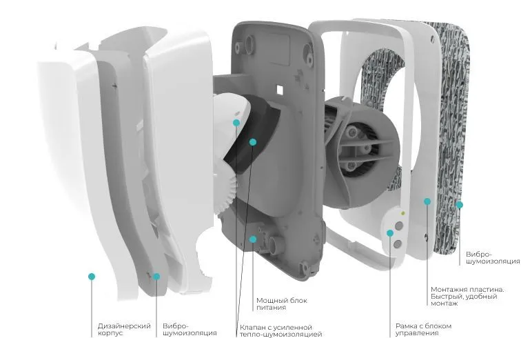 Корпус изготавливается из пластика HIPS c тепло- и звукоизоляцией из эластичного пенополиуретана и изолона. Внутри корпуса прибора размещаются: вентилятор, плата управления, датчики температуры, Wi-Fi модуль. Патрубок из корпуса выведен горизонтально и оснащен уплотнителем из вспененного каучука для герметичного соединения. На задней стенке корпуса предусмотрены магнитные крепления для удобства установки корпуса на монтажную пластину.