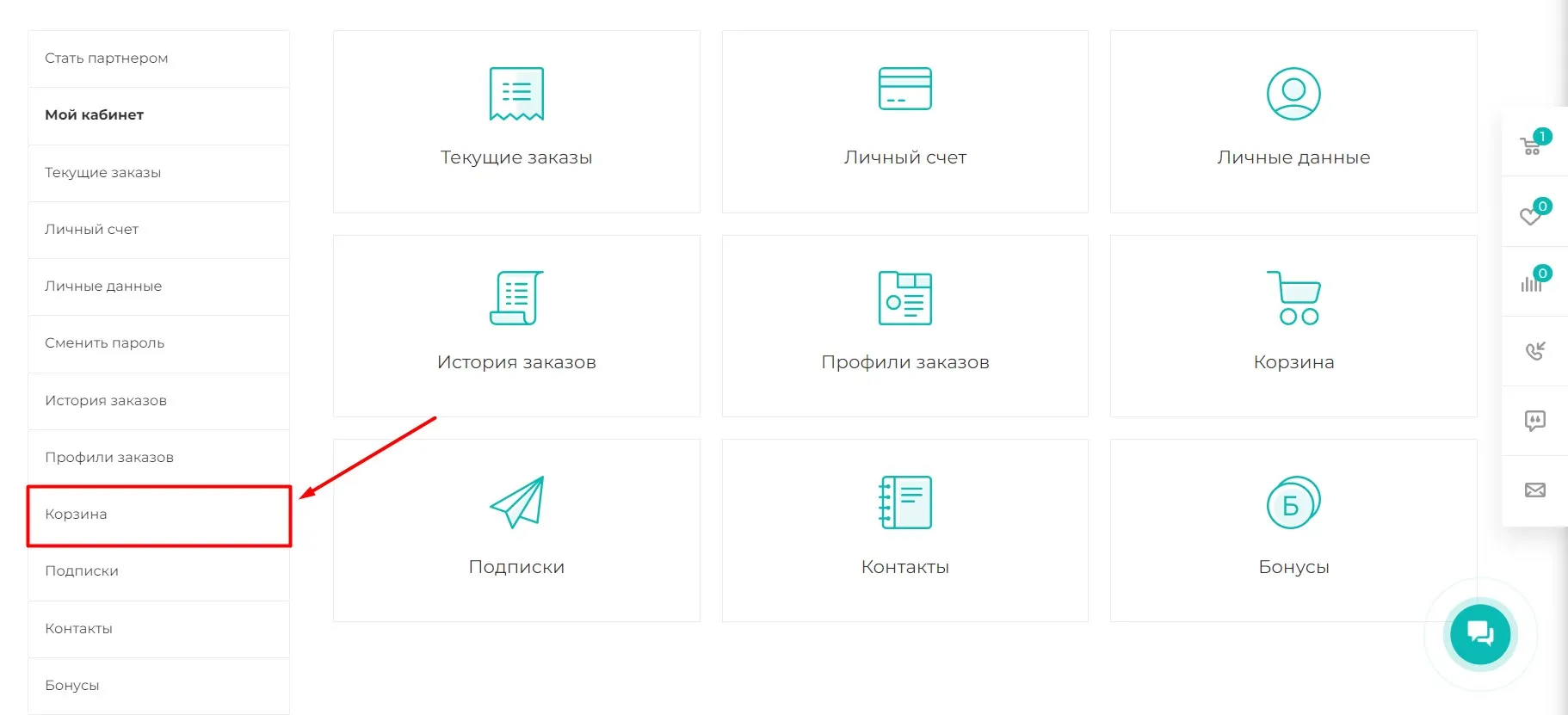 Третий способ (для авторизованных пользователей): откройте вкладку корзина в “Моём кабинете” на сайте