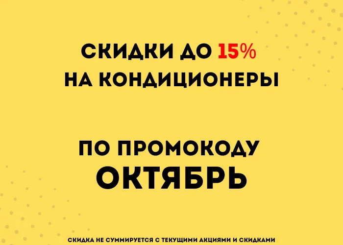 С 1 по 30 октября действует специальная акция: Скидка до 15% на все модели кондиционеров при использовании промокода ОКТЯБРЬ.